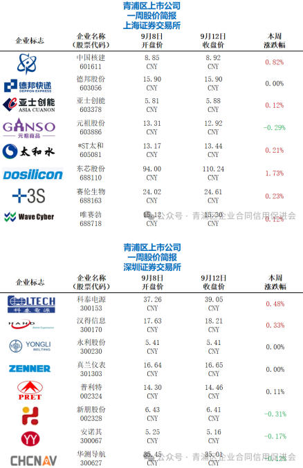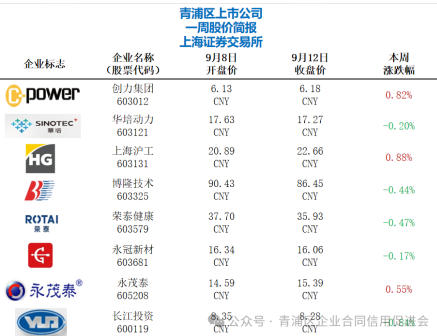 今天,青浦区企业合同信用促进会为大家展示 9 月 8 日 - 9 月 12 日期间青浦区上市公司的股价情况,其中青浦促进会会员单位共12家,分别是:科泰电源、汉得信息、永利股份、真兰仪表、创立集团、华培动力、上海沪工、博隆技术、荣泰健康、永冠新材、永茂泰、威贸电子。