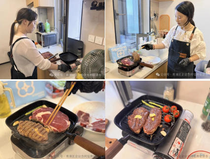 在分享会的茶歇时刻,青浦促进会的会员单位上海新紫鸿食品有限公司带来了自家的热门产品。他们提前备好专业设备与齐全食材 —— 牡蛎、眼肉牛排、西冷牛排,研磨盐、欧芹、迷迭香等调味配料,活动现场精心煎制牛排,用锡纸仔细包裹保温、醒肉。