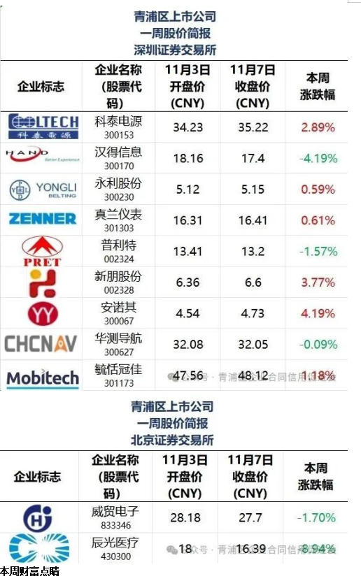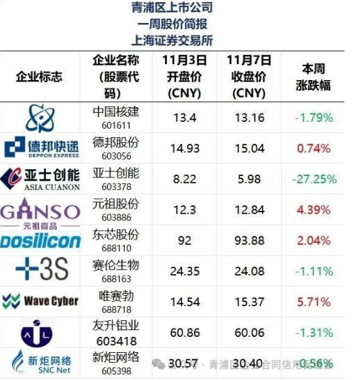 本文“青浦区上市公司一周股价简报”所有在列公司排名不分先后。