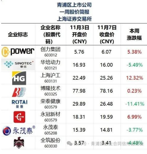今天,青浦区企业合同信用促进会为大家展示11月3日-11月7日期间青浦区上市公司的股价情况,其中青浦促进会会员单位共14家,分别是:创立集团、华培动力、上海沪工、博隆技术、荣泰健康、永冠新材、永茂泰、全筑股份、新炬网络、科泰电源、汉得信息、永利股份、真兰仪表、威茂电子。