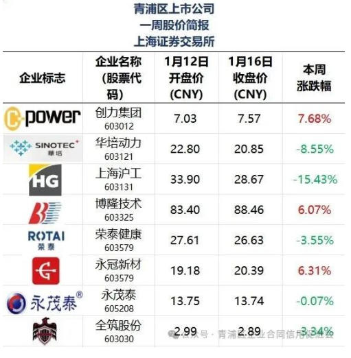 今天,青浦区企业合同信用促进会为大家展示1月12日-1月16日期间青浦区上市公司的股价情况及分享本周财富热点,其中青浦促进会会员单位共13家,分别是:创立集团、华培动力、上海沪工、博隆技术、荣泰健康、永冠新材、永茂泰、全筑股份、新炬网络、科泰电源、汉得信息、真兰仪表、威茂电子。