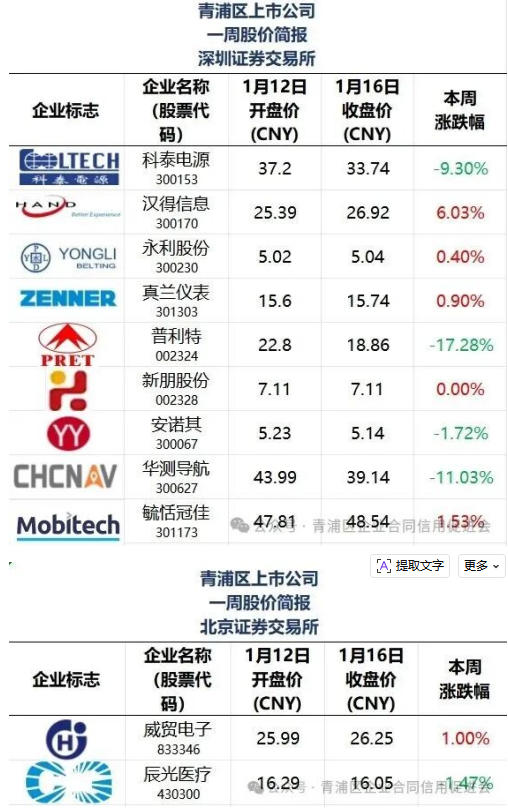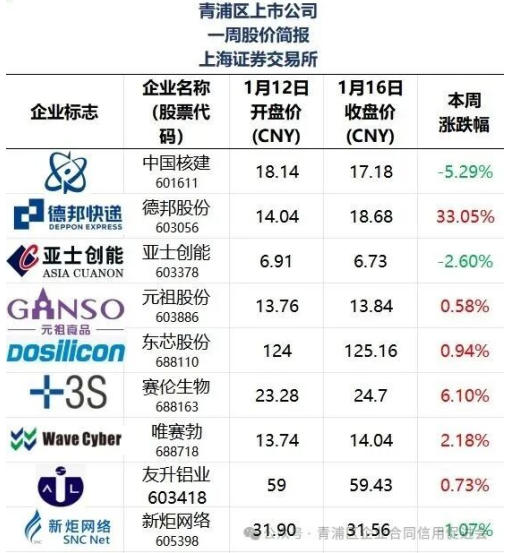 本文“青浦区上市公司一周股价简报”所有在列公司排名不分先后。