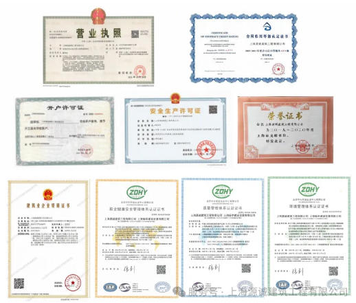 公司以争创行业先锋为追求,夯实专业能力,精进服务质量,恪守对每个客户的承诺和责任。获得了由 CNAS 中国认可管理体制颁发的《质量管理体系认证证书》《环境管理体系认证证书》、《职业健康安全管理体系认证证书》。2015 年起荣获浦东新区文明单位称号以及上海电气集团所属单位优秀基建商奖,2016 年起荣获上海市守合同重信用企业,2018 年荣获热心为民暖心工程奖、上海市浦东新区血液管理办公室表彰和上海浦东新区社会发展基金会捐赠书,2021 年荣获上海市浦东新区光彩事业促进会颁发的光彩事业爱心奖,2024 年荣获万祥镇杰出贡献奖,承接的曹路镇民耀路 98 弄等小区屋面及相关设施改造项目参与评选 “红花杯” 并荣获区文明工地。