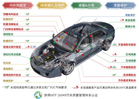 汽车领域:永冠为全球汽车主机厂提供高品质汽车线束胶带、内外饰双面胶带、分色与遮蔽胶带解决方案,以及汽车后市场提供车衣膜、改色膜、窗膜解决方案。