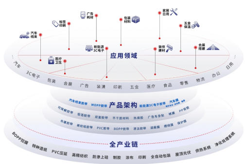 永冠胶粘产品,广泛服务于汽车、新能源、消费电子、智能家居、新质生产力等工业领域,以及包装、快递物流、数码喷印、装修建材、办公文具、医疗卫生等民用领域。