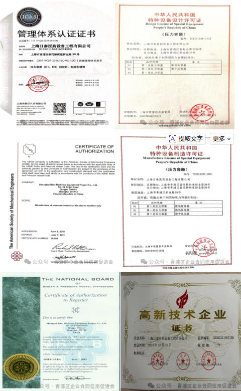 资质完备:是中国制药装备行业协会、上海市特种设备管理协会成员单位,持有中华人民共和国特种设备制造许可资格(可制造一、二类压力容器)及美国 ASME(U)钢印,资质覆盖国际国内双重标准;