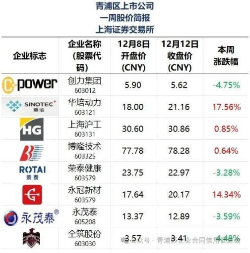 今天,青浦区企业合同信用促进会为大家展示12月8日-12月12日期间青浦区上市公司的股价情况及分享本周财富热点,其中青浦促进会会员单位共13家,分别是:创立集团、华培动力、上海沪工、博隆技术、荣泰健康、永冠新材、永茂泰、全筑股份、新炬网络、科泰电源、汉得信息、真兰仪表、威茂电子。