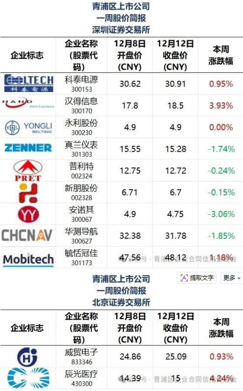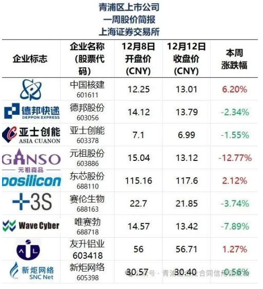 本文“青浦区上市公司一周股价简报”所有在列公司排名不分先后。