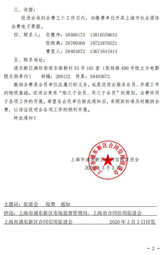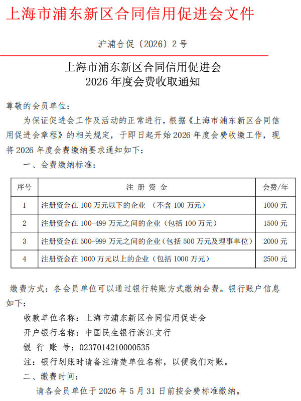 浦东新区合同信用促进会2026年度会费收取通知