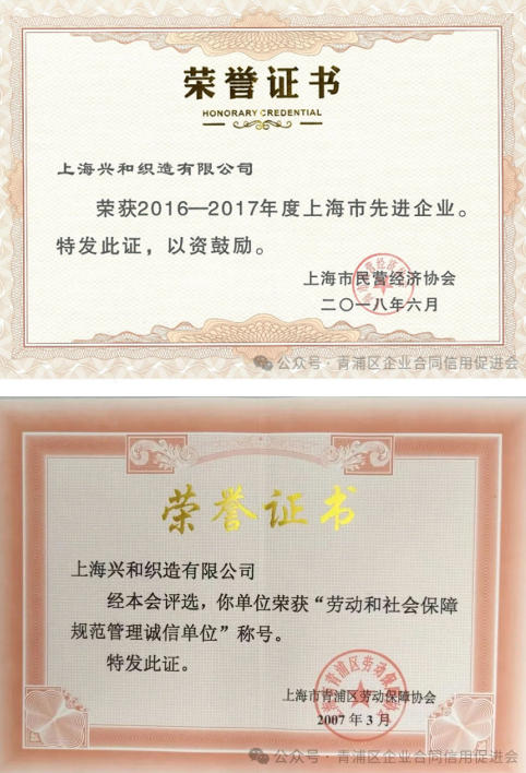 在稳健发展的同时,上海兴和织造始终将规范运作、诚信经营放在首位,依法纳税、履行社会责任,逐步成长为兼具实力与担当的企业。公司不仅连续多年参与 “守合同重信用” 评估并获评 “上海市守合同重信用企业”,还先后斩获 “上海市先进企业”“纳税信用 A 级企业”“银行信用等级 AA + 企业” 等多项荣誉。2006 年至今,公司更是顺利通过 ISO9001:2015 质量管理体系、ISO14001:2015 环境管理体系及 ISO45001:2018 职业健康安全管理体系认证,以标准化管理筑牢发展根基。