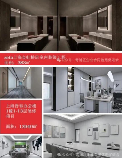 商业与办公空间:从 zeta 上海金虹桥店 383㎡室内装饰,到上海晋泰办公楼 1-13 层 13940㎡整体装修,再到无锡丰润投资办公室、厦门国际银行上海分行办公楼装修,打造兼具实用性与美观度的办公环境。