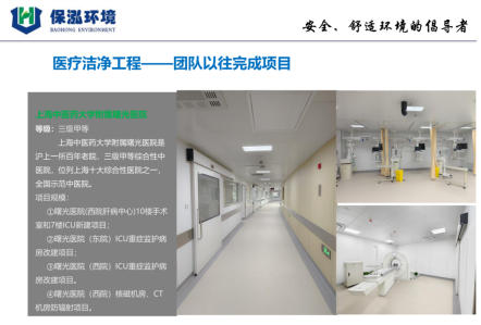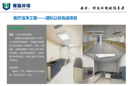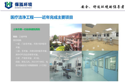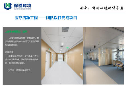 保泓(上海)环境工程有限公司,是一家专业致力于医学环境控制的集设计、施工、咨询与服务为一体 的系统服务商。公司秉承成为"安全、舒适环境的倡导者"的发展理念,积极进取,努力开拓,用最前沿的技术来 推动医疗健康事业的发展。