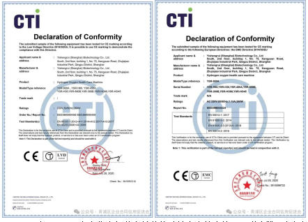 1 、2020年4月,益生瑞氢氧康养机YSR-450A、YSR-900A通过IEC60335-1标准的检测,荣获欧盟CE认证、美国FCC认证。