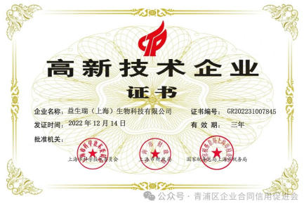 11、2023年3月15日,益生瑞收到了由上海市科学技术委员会、上海市财政局、上海市国家税务局和上海市地方税务局联合颁发的“高新技术企业”认定证书,由此正式迈入高新技术企业行列。