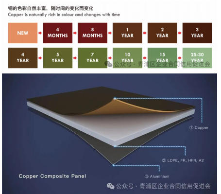 铜复合板以 “铜 | 芯 | 铝(或钢)” 结构保留真铜质感,色彩随时间变化独具韵味。