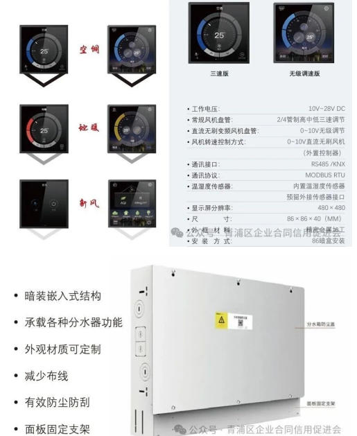 温控与环境产品:三合一智能温控器一屏掌控空调、地暖、新风,综合空气质量监测屏实时监测 PM2.5、CO2、TVOC 等多项指标,打造健康舒适空间;