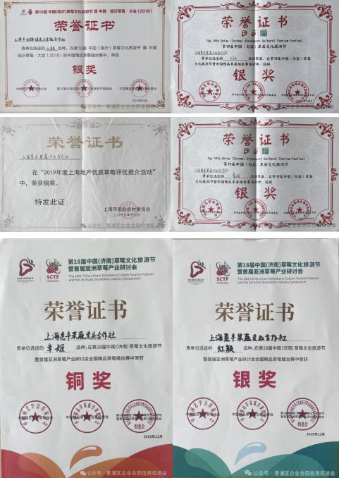 凭借过硬品质,合作社多次在全国及上海各类草莓评优活动中斩获金银大奖,2018 年获第 16 届中国(临沂)草莓文化旅游节银奖,2019 年包揽上海地产草莓评优铜奖、第 18 届中国(济南)草莓文化旅游节金银奖,2020 年通过上海市 “市级合作社” 验收并获第 19 届中国(句容)草莓文化旅游节银奖,2022 年跻身上海新春农产品大联展销售前十,实力备受认可。