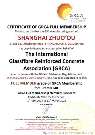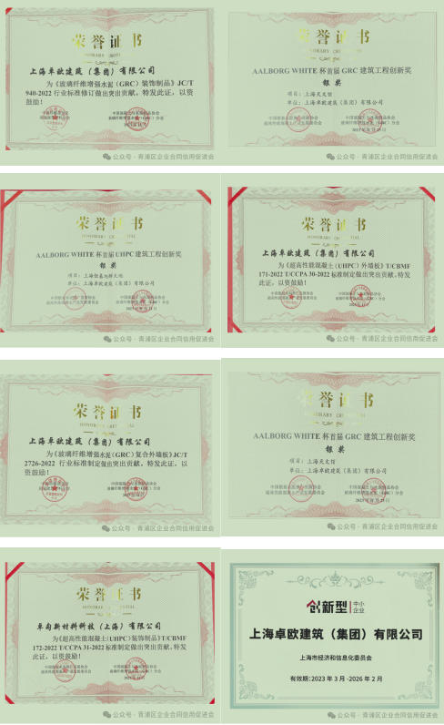 凭借专业的技术实力与规范的经营管理,卓欧建筑斩获多项权威认可。公司不仅是国际 GRCA 全资质会员单位、美国 ACI 高级会员单位、中国 GRC 协会理事单位、CCPA 装饰混凝土分会理事长单位,还成功获评上海市 “专精特新” 中小企业,通过了上海市环评认证及 ISO 9001、ISO 14001、OHSAS 18001 三大体系认证,同时也是上海市青浦区建设交通协会会员单位,多项资质为企业发展保驾护航。