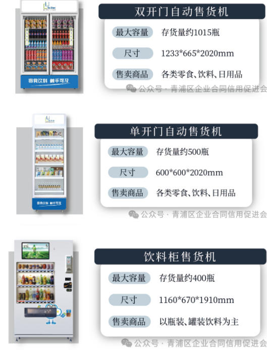 兼顾主流品牌机型的租赁与销售业务,提供双开门、单开门、饮料柜三类核心设备:双开门机型最大存货量约 1015 瓶,单开门机型约 500 瓶,饮料柜约 400 瓶,尺寸适配不同场地需求,可售卖零食、饮料、日用品、医疗用品、文创品等多样商品。
